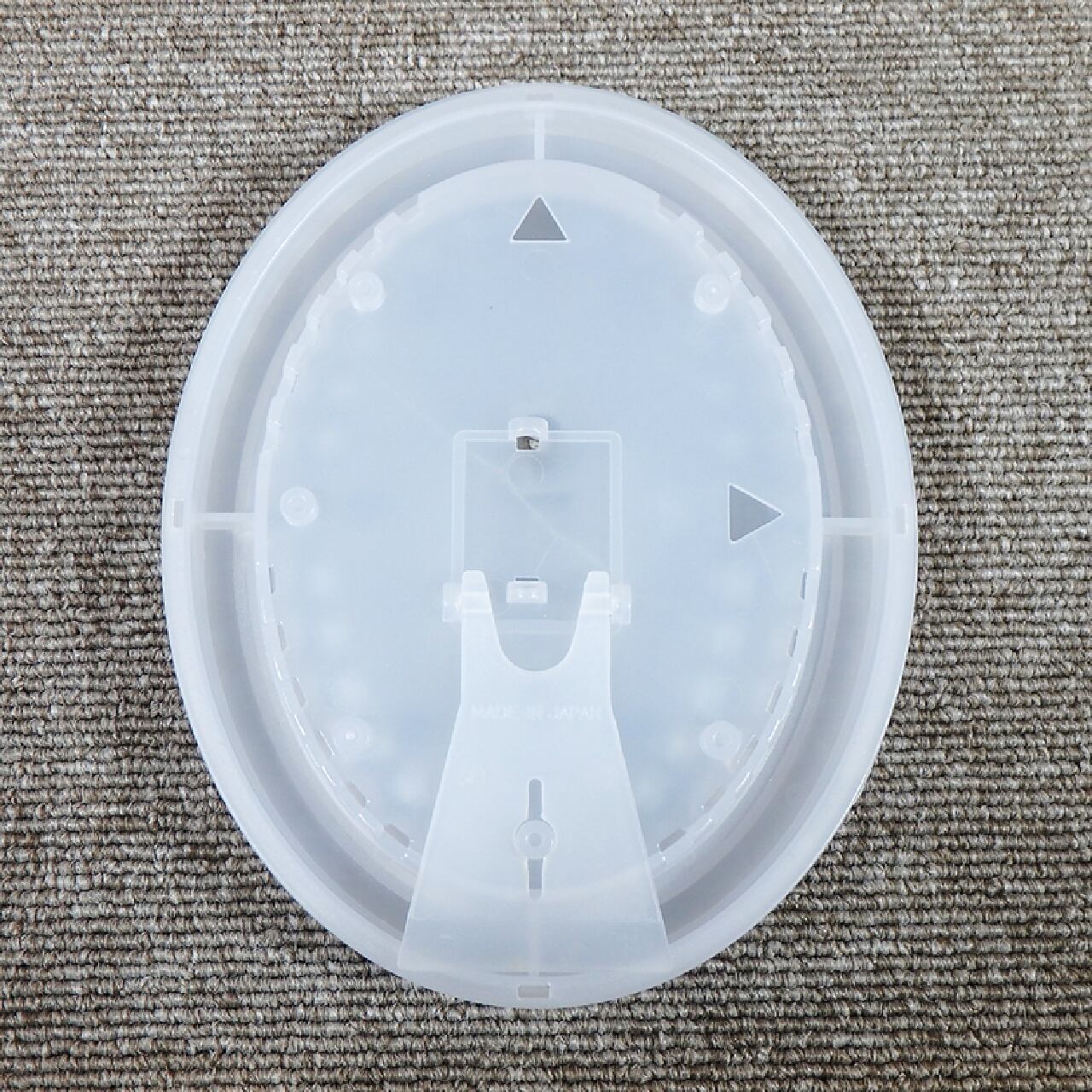 楕円形のケースであり、背面スタンドで自立して、壁掛け設置も可能です。
